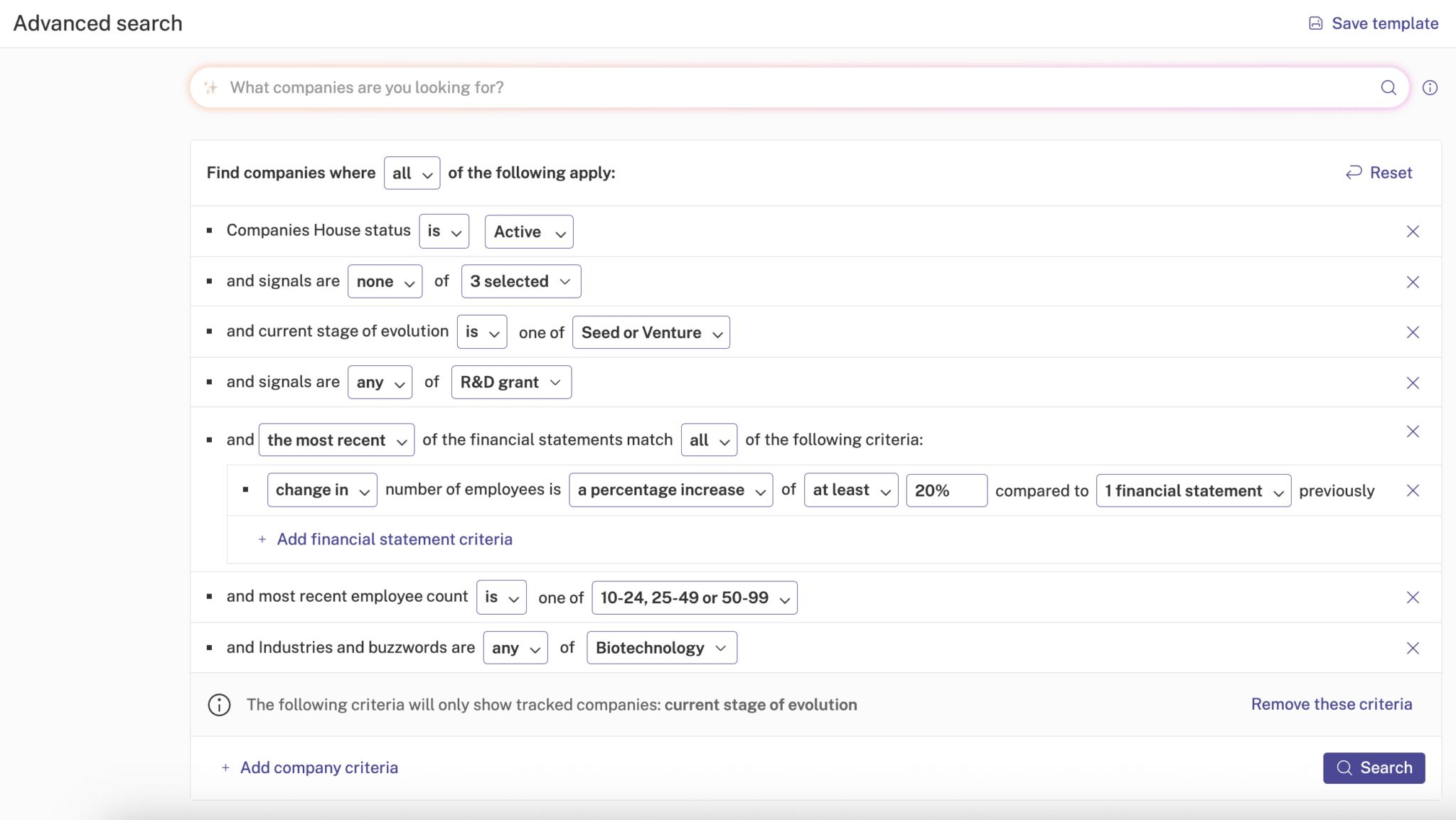 For example, active companies at Seed or Venture stage, operating in biotech that have received an R&D grant, with no equity or debt fundraisings.
