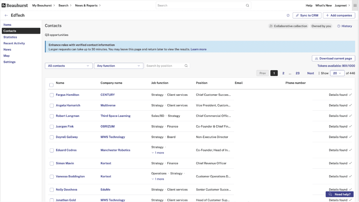 Enhanced contact details are our premium contact data offering, using a token-based system. Tokens give you access to verified phone numbers and enhanced email coverage for key people you’re interested in – directly in your collections.