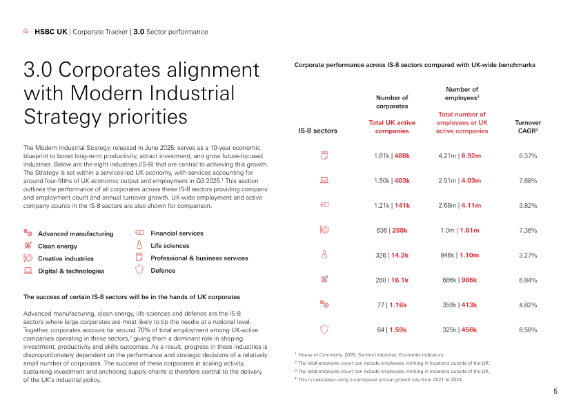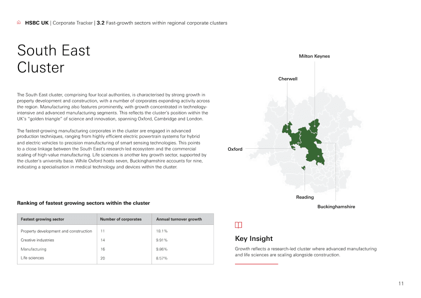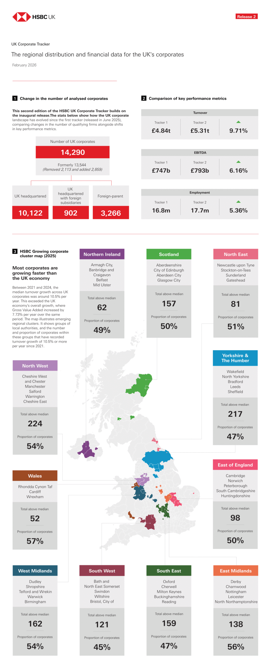 Our latest publication, produced in partnership with HSBC UK, examines the financial health and growth dynamics of 14,290 UK corporates. The report explores how corporate clusters are forming around regional strengths, creating embedded supply chains and employment hubs beyond London. Key findings: Earnings outpacing debt – EBITDA now sits 70% above pre-pandemic levels, compared with net debt at 55% above 2019, signalling strengthening balance sheets across the corporate landscape. Industrial Strategy alignment – Corporates account for around 70% of employment in advanced manufacturing, clean energy, life sciences and defence – sectors central to the UK’s economic strategy. Regional growth is not uniform – New areas of corporate strength are emerging across the UK’s regional clusters. Financial and professional services are expanding in the North West and Yorkshire, drawn by cost advantages and operational depth. Scotland’s digital and technology growth is broadening across the major cities, pointing to a more distributed and resilient technology ecosystem rather than reliance on a single urban centre. |