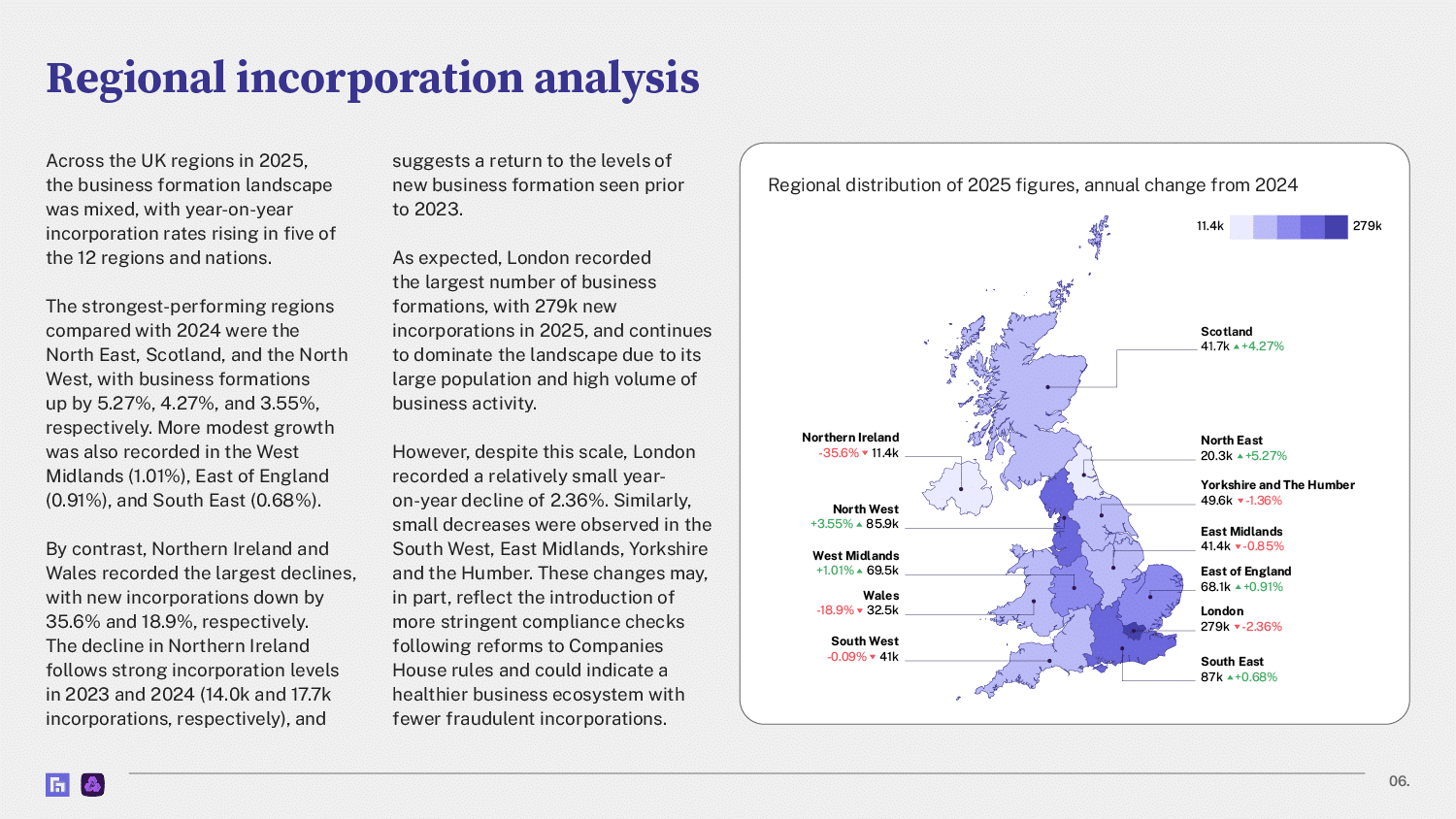 London recorded the highest number of incorporations (279k), while the North East, Scotland, and the North West led regional growth. Sector analysis highlights continued strength in real estate and rapid expansion in business and domestic software development.