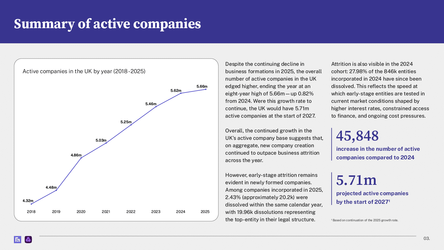 A total of 832k new companies were incorporated during the year, while the UK’s active company base reached a record 5.66m, the highest level in eight years. Although incorporation volumes declined slightly from 2024, they remained above 2021 and 2022 levels, signalling stabilisation in formation activity.